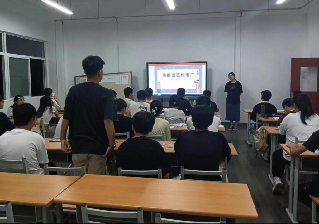 班会上,各班团支书通过图片、视频等方式,给同学们讲解了普通话的由来、什么是普通话,和同学们探讨了学习普通话的重要意义。