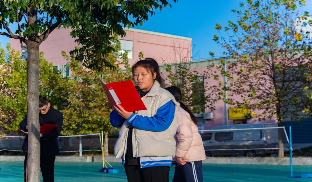 国旗护卫队的同学们迈着铿锵有力的步伐,护送着五星红旗走向旗杆。全体师生庄严面对国旗,在激昂的国歌中注视着国旗冉冉升起,迎风飘扬。