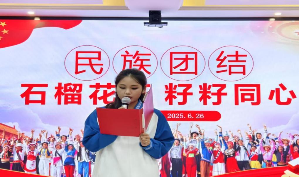 共绽团结之花,书写多彩青春。沙亚·革命发言,她说“今天看到大家欢聚一堂,就像看到一片盛开的民族团结之花。每个人都是校园大家庭中民族团结的种子,更是追梦路上的赶路人。”