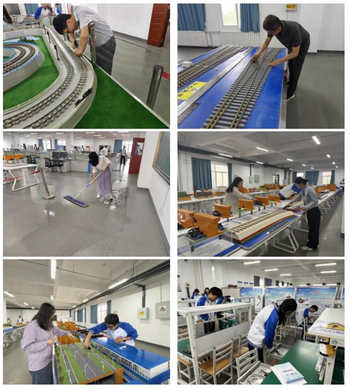 专业维护,筑牢实训根基。活动期间,支部党员、入党积极分子、公司志愿者等对校内各实训基地进行全面维护。在铁道工程综合实训基地与铁道沙盘实验室,大家细致清洁轨道模型、信号设备及模拟沙盘,对设备运行状态进行逐一检查,针对线路接触不良、沙盘部件松动等问题及时维修保养,确保实训设备始终处于良好运行状态。同时,党员们对土工实训室和线桥隧模型室的工具材料进行分类整理,规范摆放区域,彻底清理卫生死角,为师生营造了整洁有序的实训环境,为后续实践教学的开展提供了坚实保障。