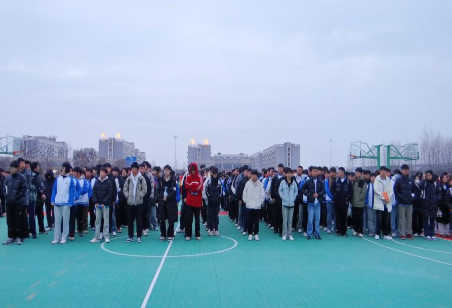 随着仪式的正式开始,全场师生肃立,气氛庄严。本次升国旗的重任交由23电气技术3班的王瑜同学担任擎旗手,他身姿挺拔,精神抖擞。护旗手则由23铁道工程4班的陈嘉合同学和24机电一体化1班的高宵博同学担任,他们紧随擎旗手,步伐整齐划一。在雄壮激昂的国歌声中,五星红旗冉冉升起,迎风飘扬。全体师生面向国旗行注目礼,齐声高唱国歌,那激昂的歌声回荡在操场上空,表达了师生们对祖国的无限热爱与崇高敬意。