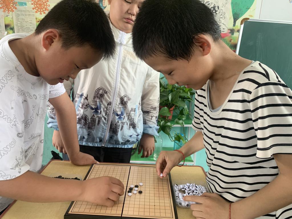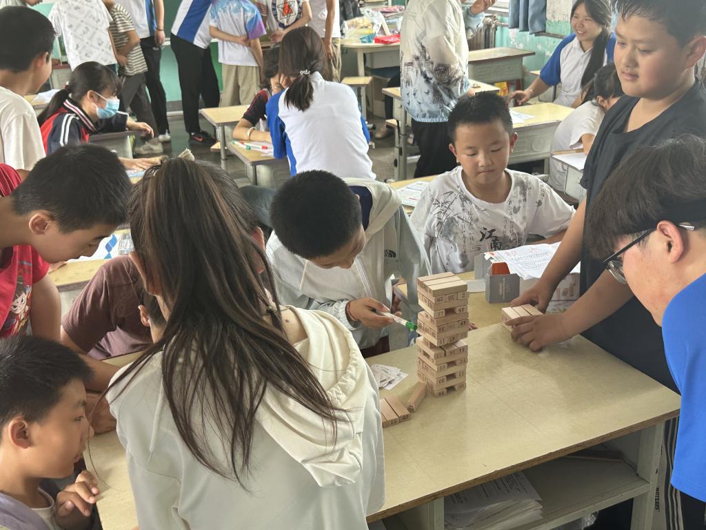 在心理健康游戏互动环节,团队精心准备了釜底抽薪、五子棋、房树人测验等活动。釜底抽薪游戏中,孩子们聚精会神地摆放杯子,在一次次尝试中锻炼了手眼协调能力和耐心;五子棋对弈时,大家沉着思考、谨慎落子,不仅体验了博弈的乐趣,还培养了逻辑思维和策略意识;房树人测验则让孩子们通过画笔描绘出自己心中的世界,队员们通过分析画作,更深入地了解孩子们的内心想法和心理状态,为他们提供个性化的心理支持。孩子们在游戏中积极参与、相互配合,校园里充满了欢声笑语,每一个孩子的脸上都洋溢着纯真的笑容。