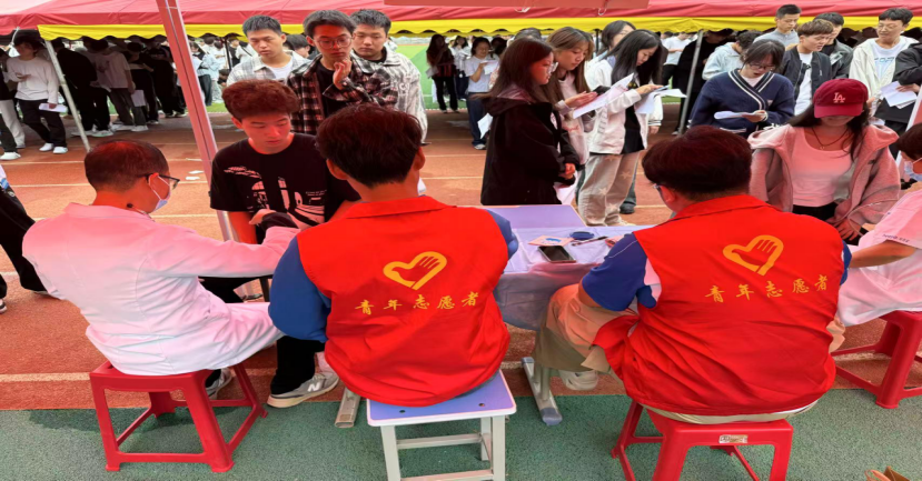 体检环节是迎新工作的重点之一。为避免新生长时间排队,志愿者们分批次带领新生前往公司大操场,现场志愿者们分工明确,有的协助医护人员维持秩序,有的为空腹抽血的同学递上面包和牛奶,还有的全程护送身体不适的新生前往观察区休息。
