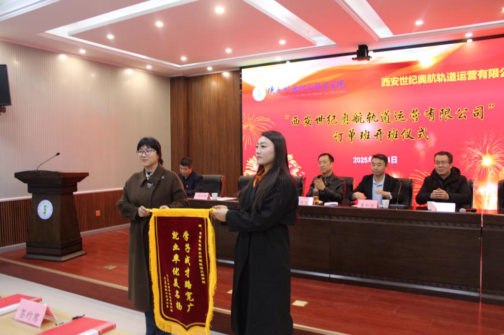 为激励订单班员工努力学习,西安世纪奥航轨道运营有限公司向公司捐赠奖学金,满春燕代表公司向公司授予了捐赠证书。订单班的员工代表侯显瑞进行了表态发言,他号召同学们立志要成为具有社会责任感、创新精神和实践能力的高素质技术技能型人才。